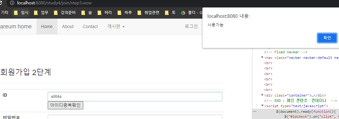 이 때 아이디중복체크를 위해 현재 step2.jsp 화면이 바뀌지 않고