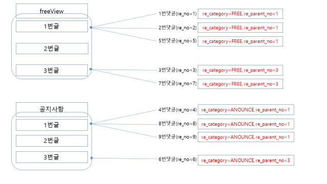 re_category 컬럼이 있지만 애초에 공지사항댓글테이블 reply_anounce, free_board댓글 테이블 reply_free_board를 따로 만들 수도 있다.)