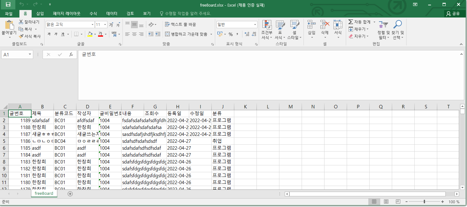 freeList화면에서 'excelDown'버튼을 누르면 다음과 같이 excel이 나온다.