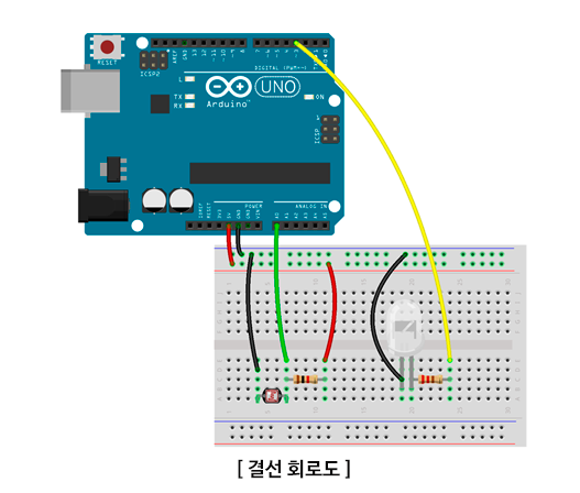 조도를 측정하기 위해서는 풀업 회로를 사용하며 풀업 저항 사용시에는 조도센서의 저항 값에 따라