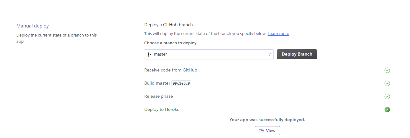 배포에 관한 로그가 나오고 배포가 완료된 후에는 View버튼이 보일 것이다.