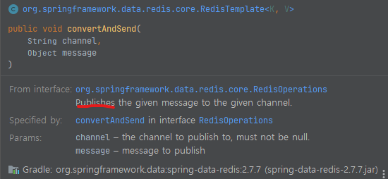 ※publisher는 따로 없고 convertAndSend()메소드를 통해 topic(channel)만 지정해주면 된다.