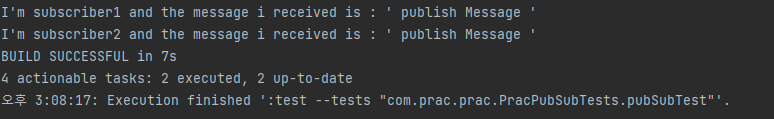 topic1 채널을 통해 메세지를 publish하면 subscriber1,2는 메세지를 수신받고 onMessage()를 실행한다.