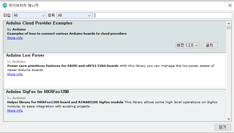 스케치에서 상단탭에 스케치-라이브러리 포함하기-라이브러리 관리하기를 선택합니다