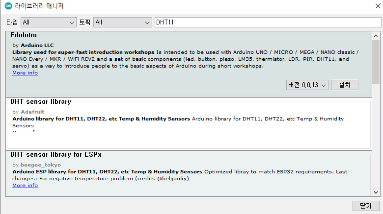 검색창에 DHT-11을 검색합니다. DHT sensor library 선택후 install all을 클릭합니다.