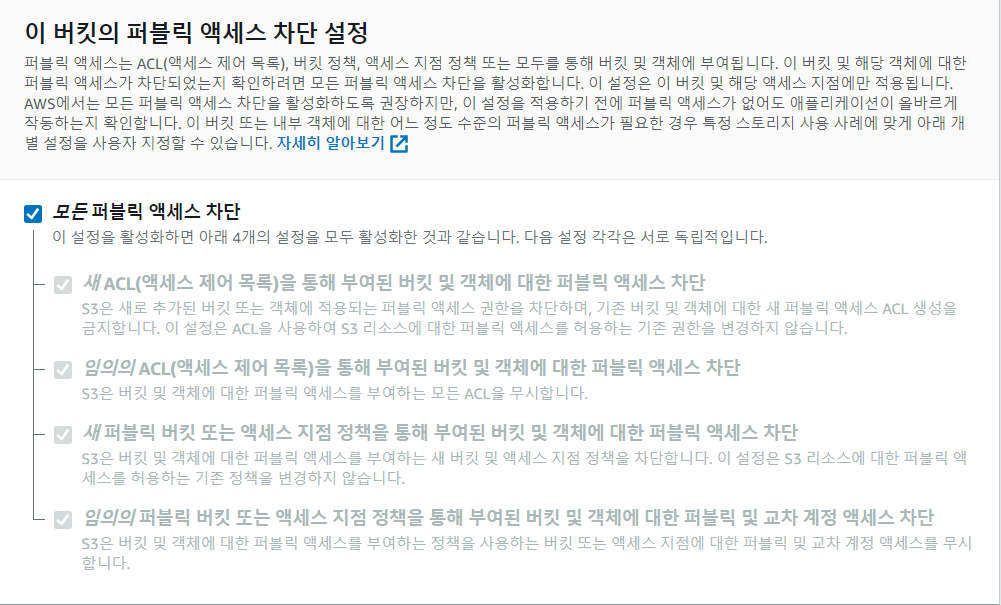 보안 관련 사항으로는 퍼블릭 엑세스 차단(default)을 합니다.