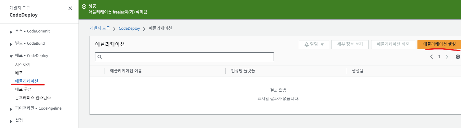 CodeDeploy를 검색한 후 애플리케이션 탭- 애플리케이션 생성을 클릭합니다.