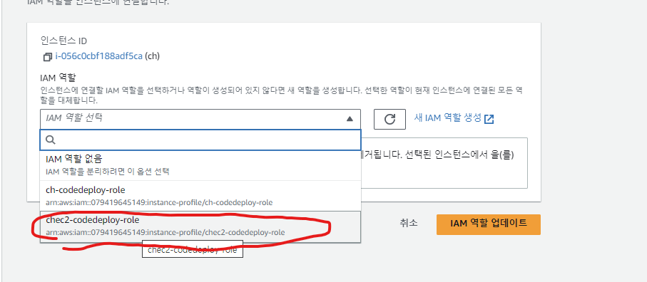 방금 IAM에서 만든 역할을 선택한 후 업데이트 버튼을 클릭합니다.