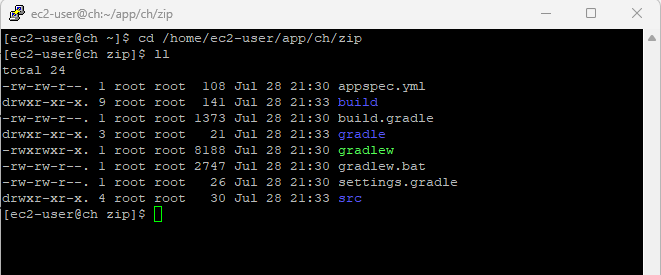 /home/ec2-user/app/ch/zip으로 복사되어 압축을 풀 예정입니다.