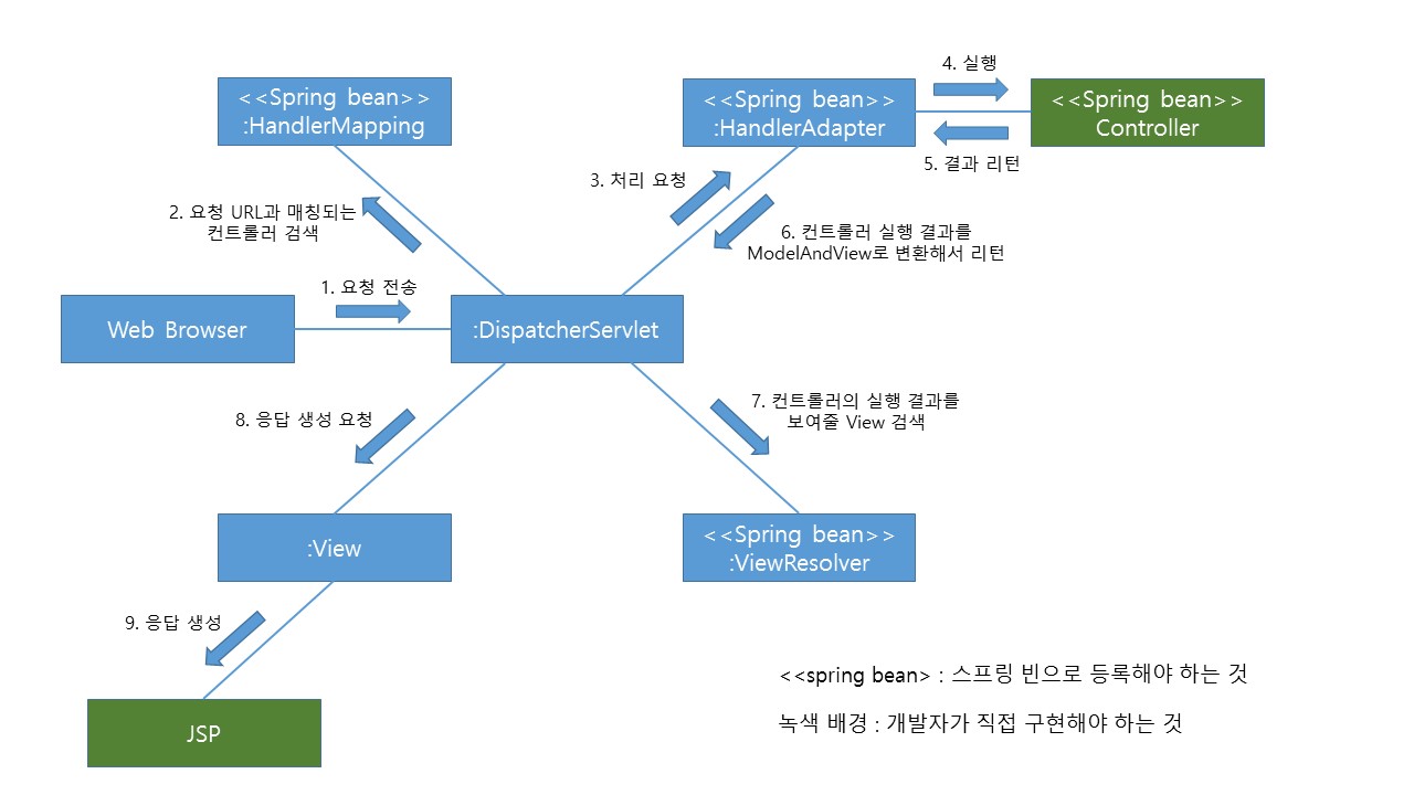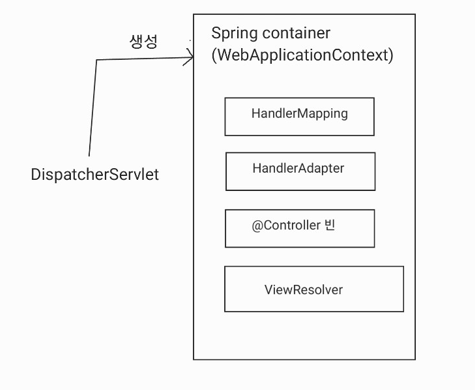 DispatcherServlet은 요청을 처리할 때 여러 객체들을 사용하는데 이 객체들은 SpringContainer(WebApplicationContext)에 등록된 빈이다.