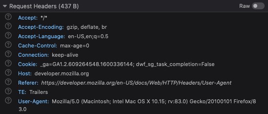 - User-Agent : 요청을 보내는 클라이언트의 대한 정보: 사용하는 웹 브라우저와 버전, OS 등