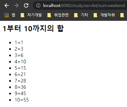 이제 서버를 키고 url에 localhost:8080/study/servlet/sum.weekend 를 요청해봅시다.