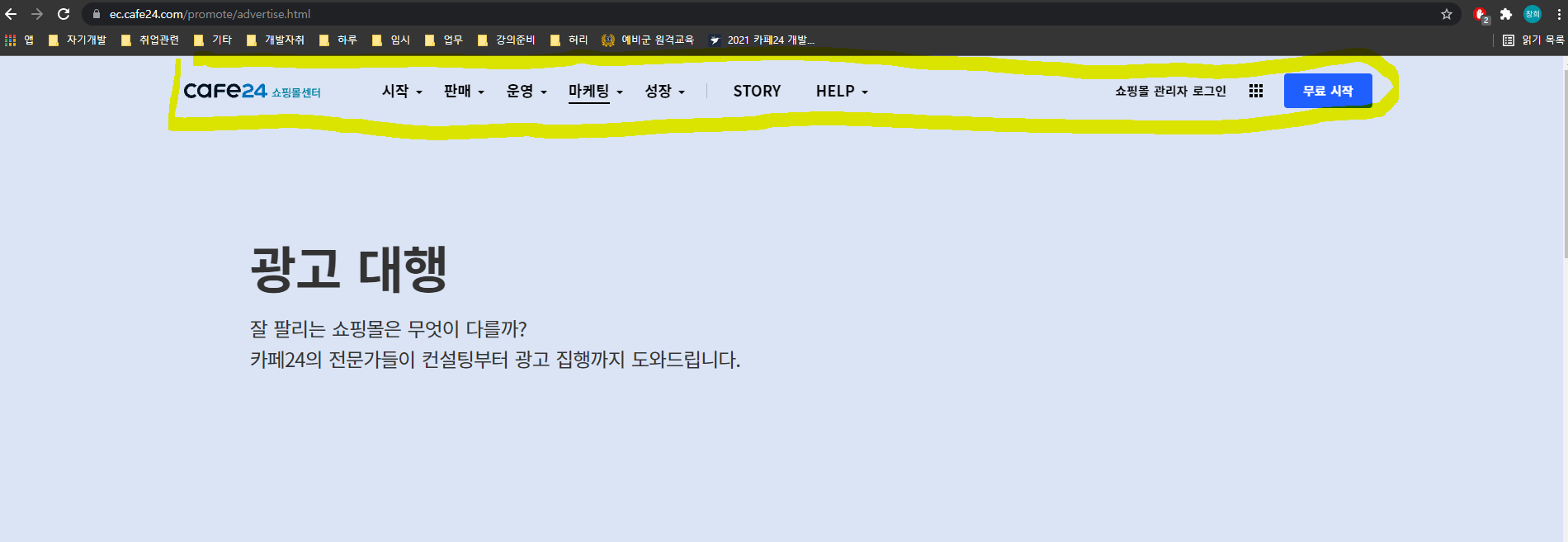 카페24 화면이다. 웹 페이지를 이동해도 모든 페이지마다 상단메뉴는 있다.