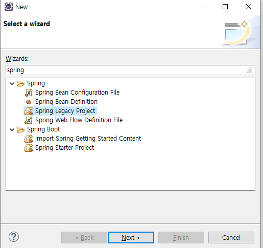 new-other를 클릭한 후 spring을 검색, spring legecy 프로젝트 선택
