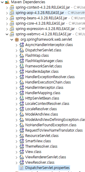 참고로 기본 설정 값은 Spring jar파일을 따운받을 때 DispatcherServlet.properties파일안에 명시돼어있다.