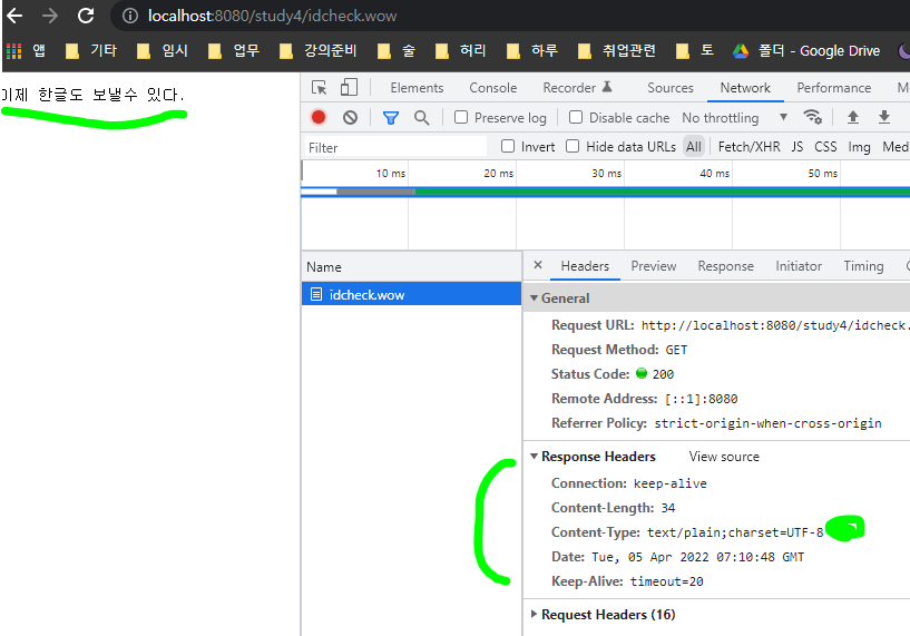 이 때 따로 설정을 안했다면 response의 header에서 content-type은 "text/html;charset=ISO-8859-1" 이다.
