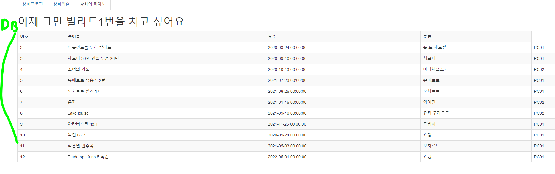 창희의 피아노에서는 Piano 테이블의 데이터를 조회해서 만들어진 jsp화면을 배치시키겠습니다.