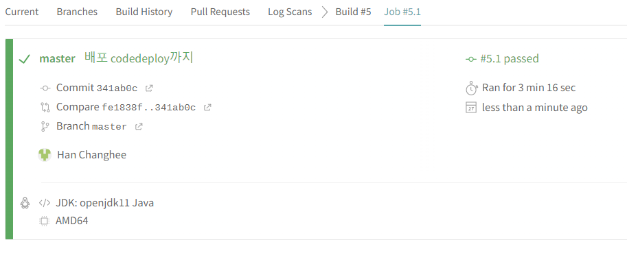 문제없이 진행됐다면 Travis CI와 CodeDeploy에서