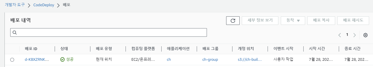 CodeDeploy가 배포까지 완료합니다.