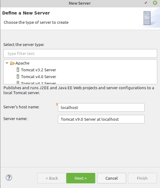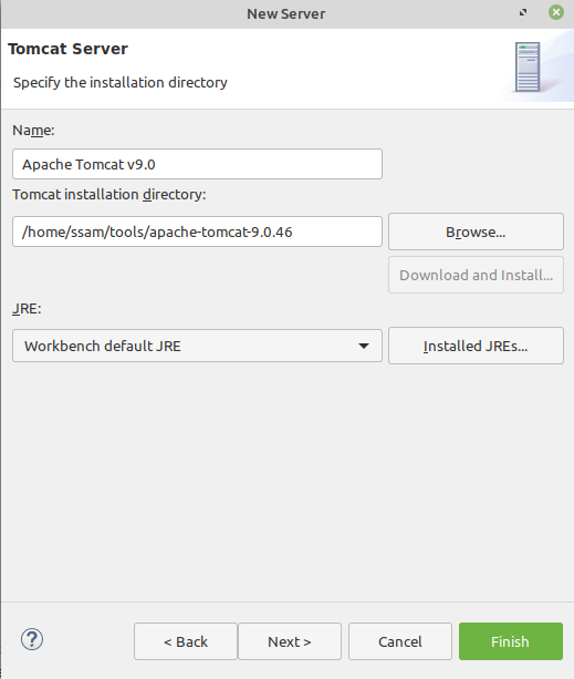 Browse를 클릭 후 /home/ssam/tools/apache-tomcat-9.0.46 까지 선택해준 후 finish를 누릅니다.