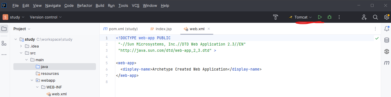 프로젝트 만들 때 Context root를 study로 선택했기 때문에 기본 path는 study일 것입니다.