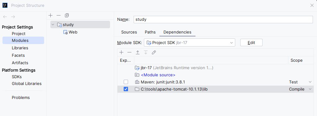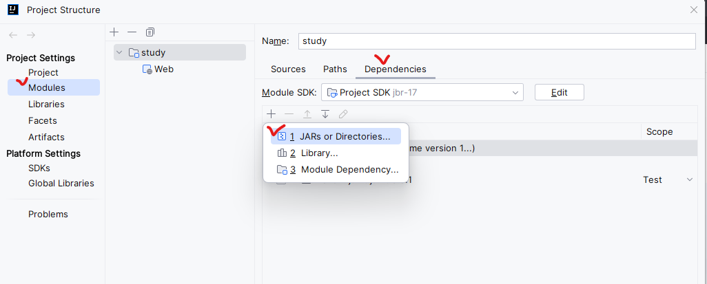 Project Structure - Modules에서 Dependencies 탭에서 + 버튼을 누른다