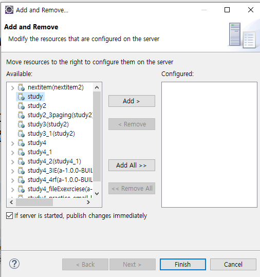 그 후 해당 프로젝트(여기선 study)를 Add 한 다음 finish를 눌러주면 됩니다