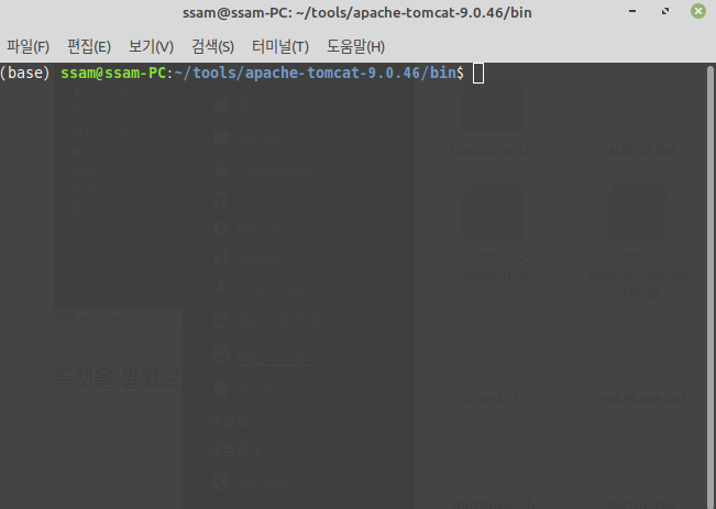 톰캣을 깔았으면 apache-tomcat-9.x.xx.폴더에 bin 파일로 이동해서 터미널창을 켜겠습니다.