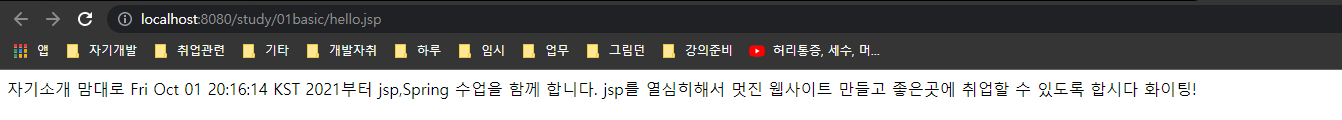 이제 브라우저에 localhost:포트번호(8080)/study/01basic/hello.jsp를 실행해줍시다.