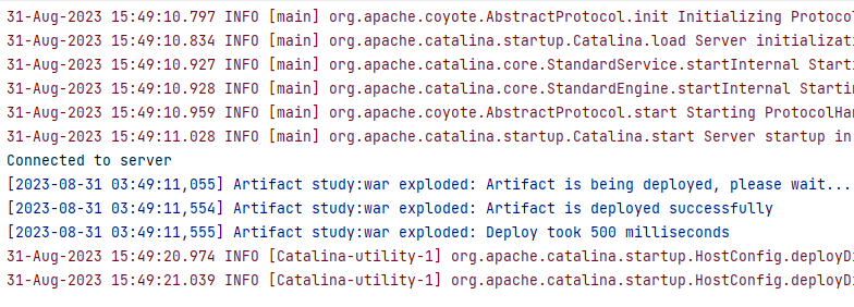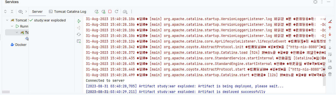 그리고 인텔리제이를 재시작한 후 톰캣을 실행하면 다음과 같이 한글이 로그에 찍힌다.
