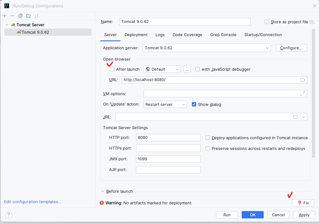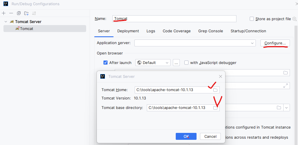 configure 후 방금 다운받은 톰캣 경로까지 선택해줍니다.