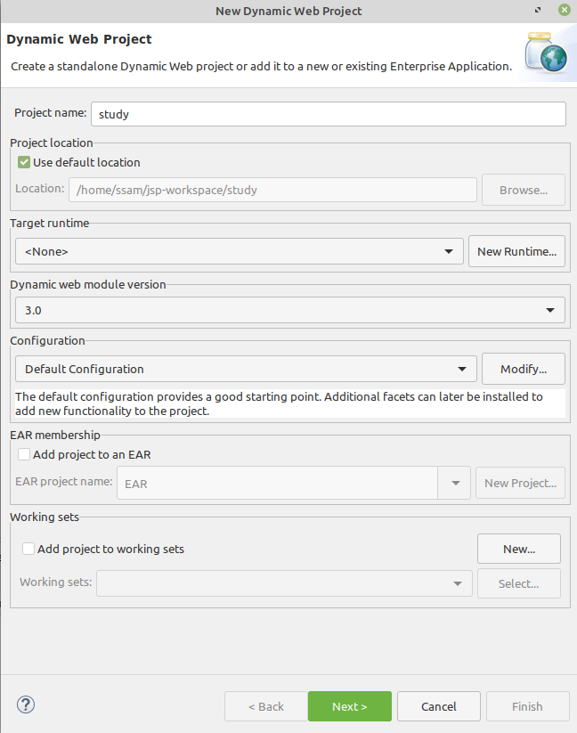 project 이름은 sutdy, Dynamic web moudle version은 3.0을 선택해 준 후 next를 누릅니다.