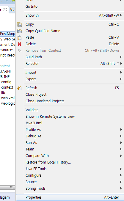 이클립스에서 프로젝트 선택 마우스 우클릭 properties 를 선택하고