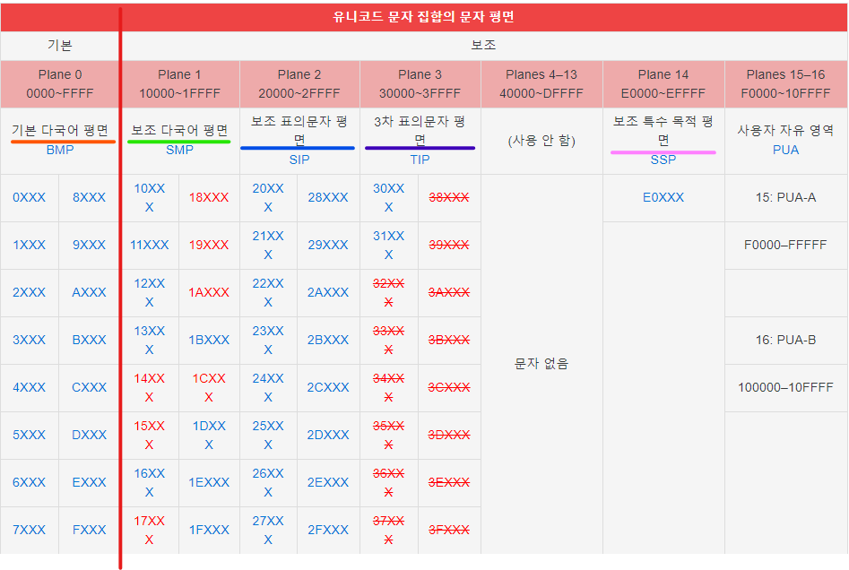 유니코드는 평면이라고 하는 세부 영역으로 나누어 관리되고 있습니다. 크게 기본평면(Basic Multilingual Plane)과 보조평면(Supplementary Multilingual Plane)으로 나눠져 있습니다.