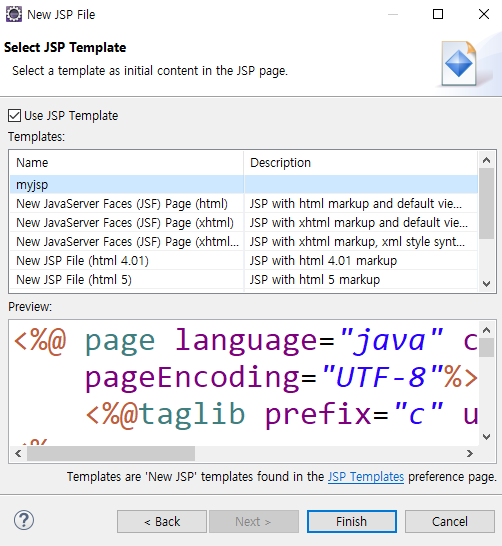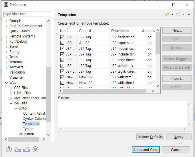 window-preferences-Web-jsp Files- Editor- Templates를 클릭합시다.