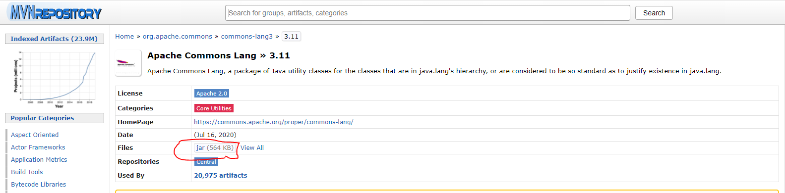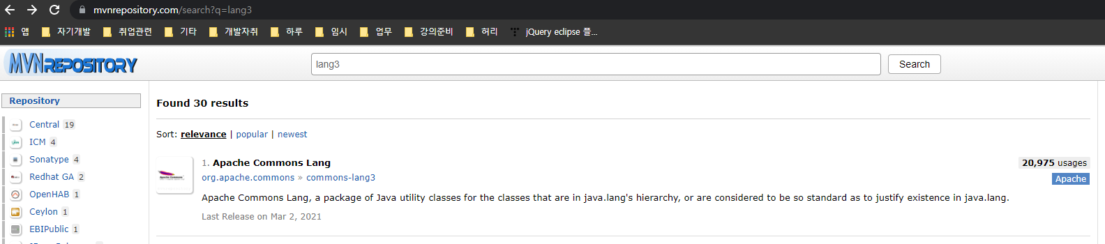 maven repostiroy 홈페이지에서 lang3를 검색해