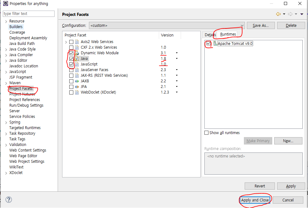 그리고 오른쪽의 Runtimes에서 Apache Tomcat 9.0 체크하자.
