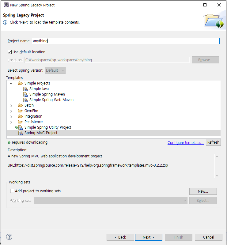 next 선택 후 spring MVC Project 선택. 프로젝트이름은 아무렇게나 지으면 된다.