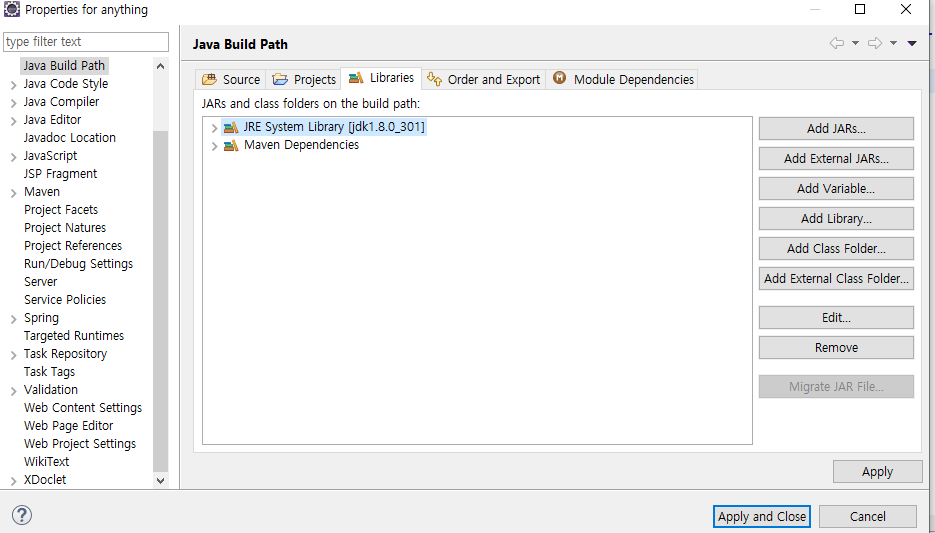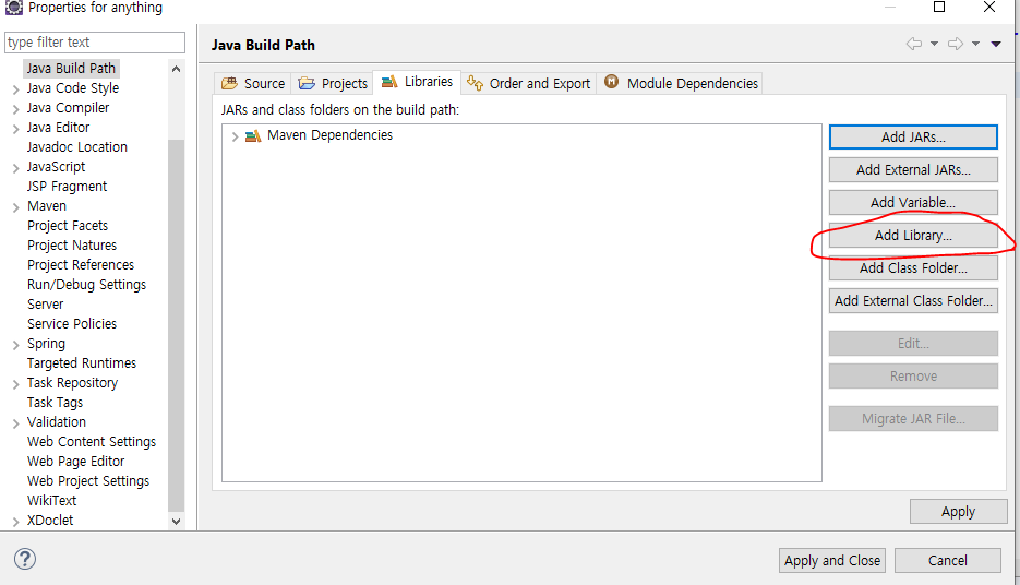 확인한 후 없다면 mvn repository에서 해당 라이브러리를 다운받아 프로젝트 라이브러리에 추가한다.
