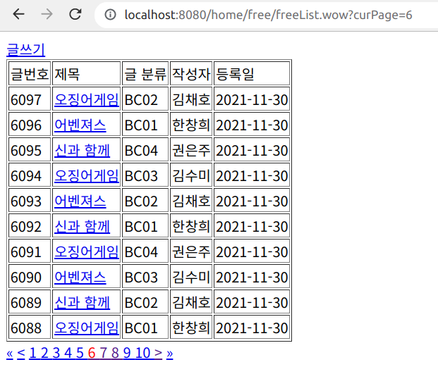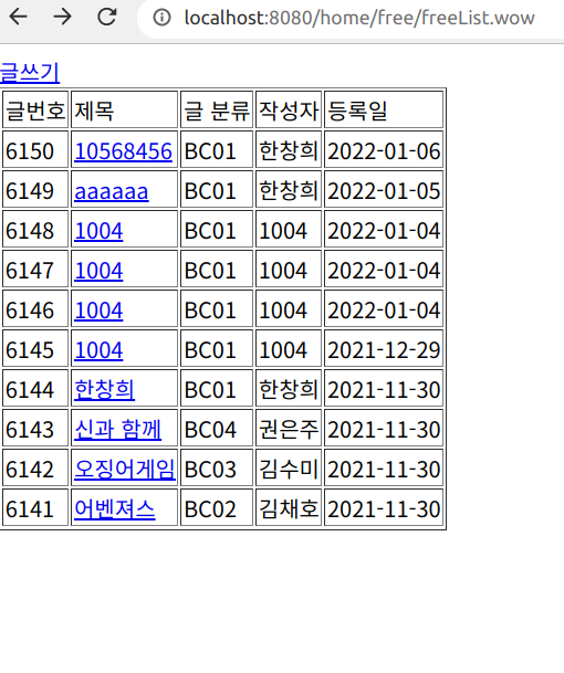 이후 다시 /free/freeList.wow를 요청하면 다음과 같은 화면이 나온다.