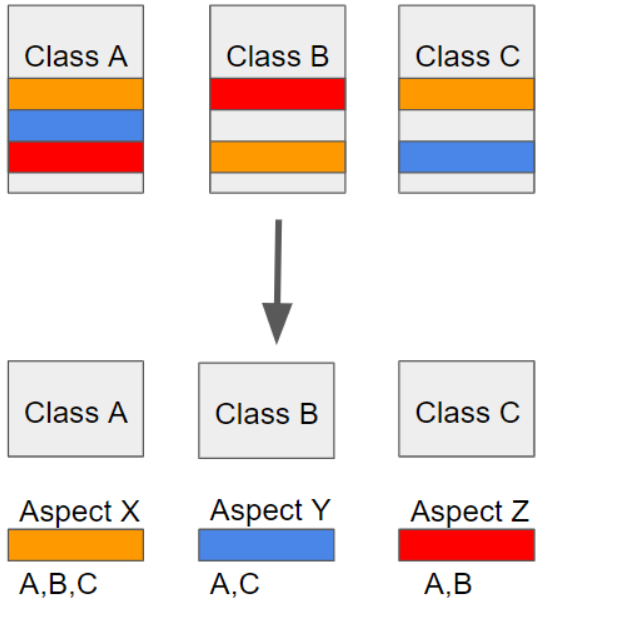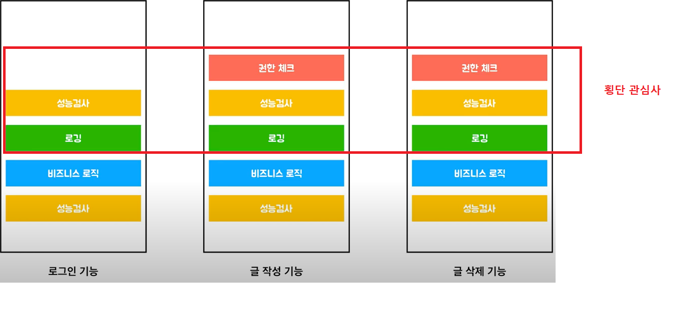 이 때 부가기능이 핵심기능에 횡단에 걸쳐서 존재하기 때문에 횡단관심(cross-cutting concern)이라고 한다.