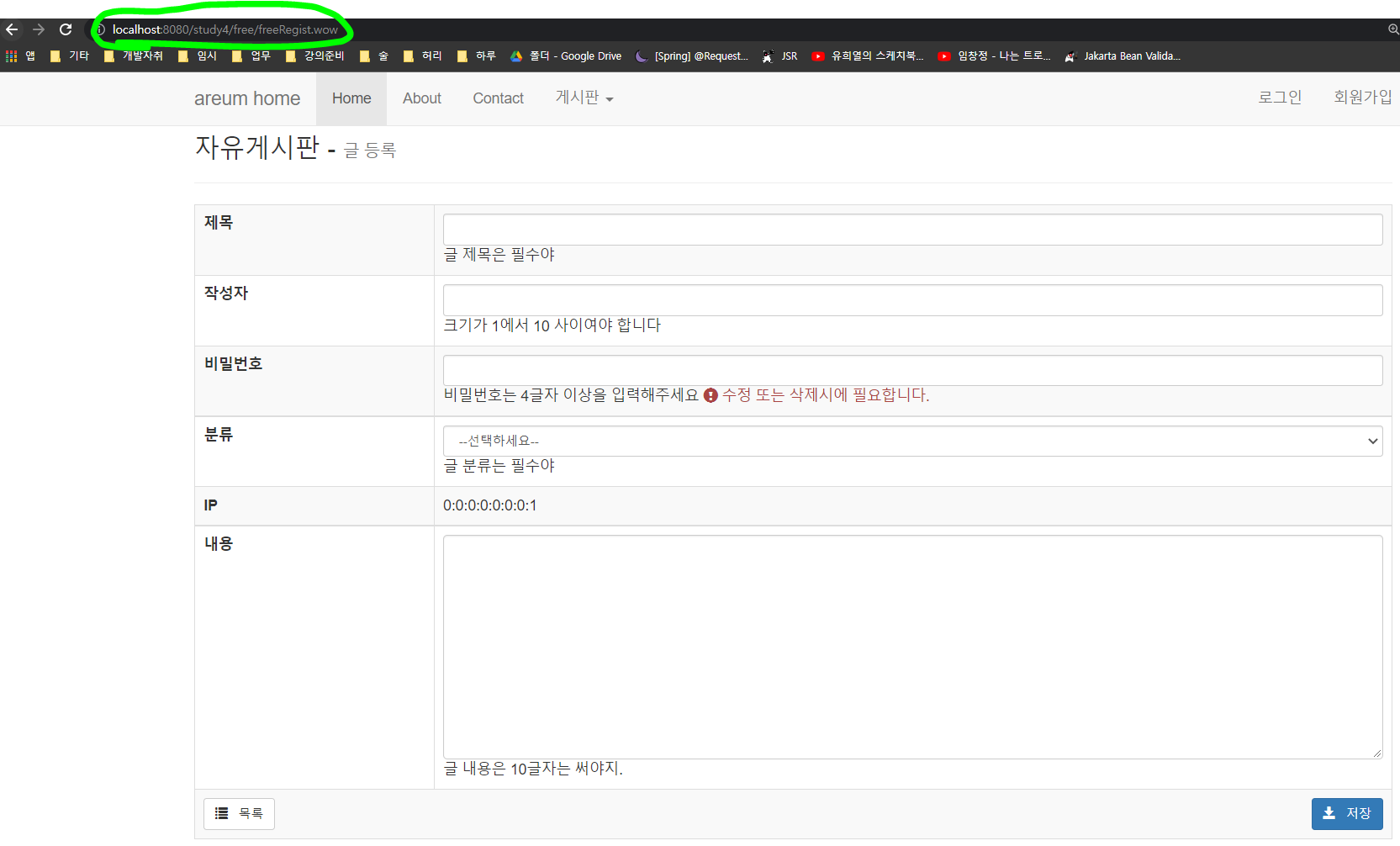 이 때 freeForm.jsp에서는 <form:errors>태그에 의해서 VO에서 설정한 message가 보이게 된다.